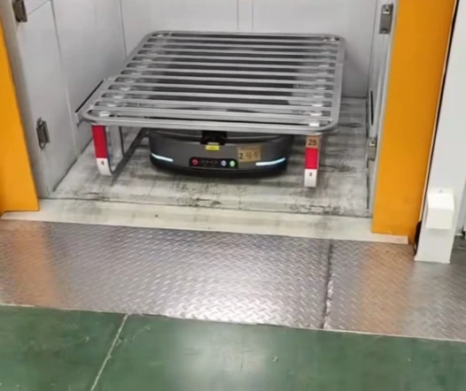 - Precision Docking & Transfer: The AGV aligns with the lift’s entrance with high precision (±10mm). The roller conveyor on the lift’s platform and at the station synchronize, pulling the pallet from the AGV into the lift cabin. The AGV is then free to execute its next task.
