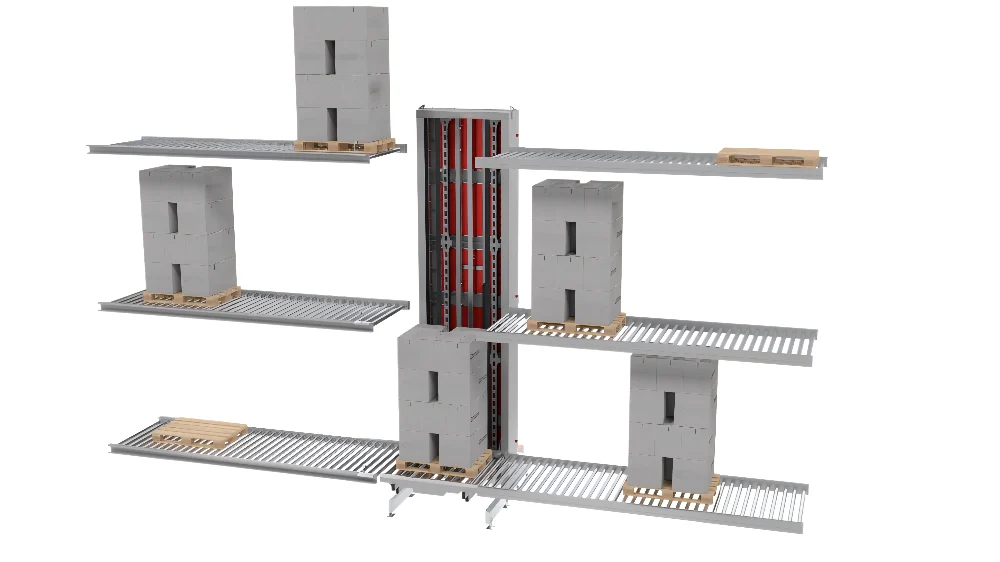 Enables seamless vertical pallet transport between different building levels, optimizing storage density and retrieval efficiency. - Production Line Integration & Mezzanine Feeding