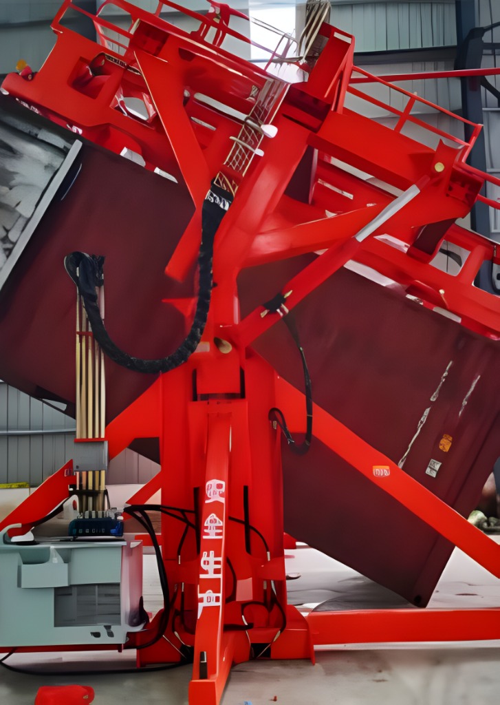 When container transport vehicles are in position, the hydraulic system drives the tilting mechanism to achieve controlled 0-90 degree tilting.